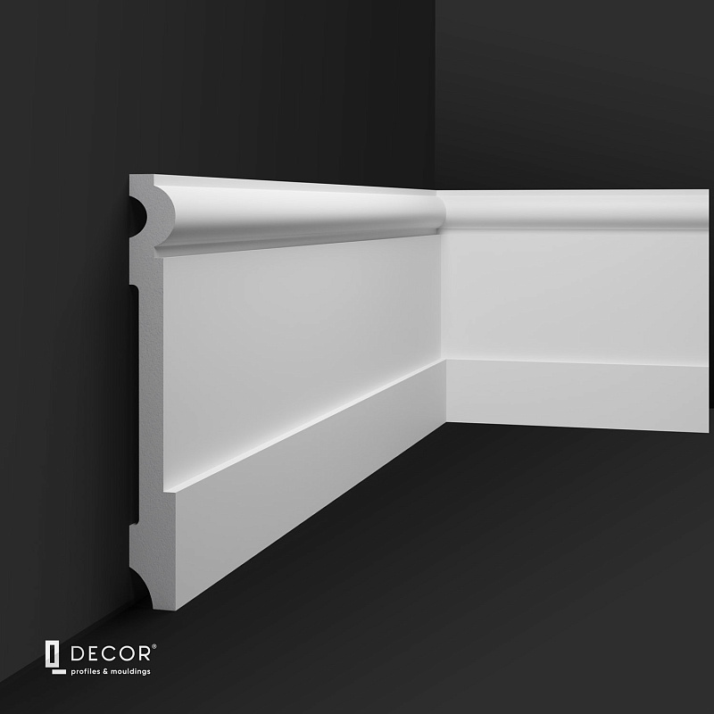 В тандеме с карнизами СХ134L, СХ138L и молдингами РХ230, РХ232, РХ234 плинтус создаёт лаконичный декор без лишних линий.
